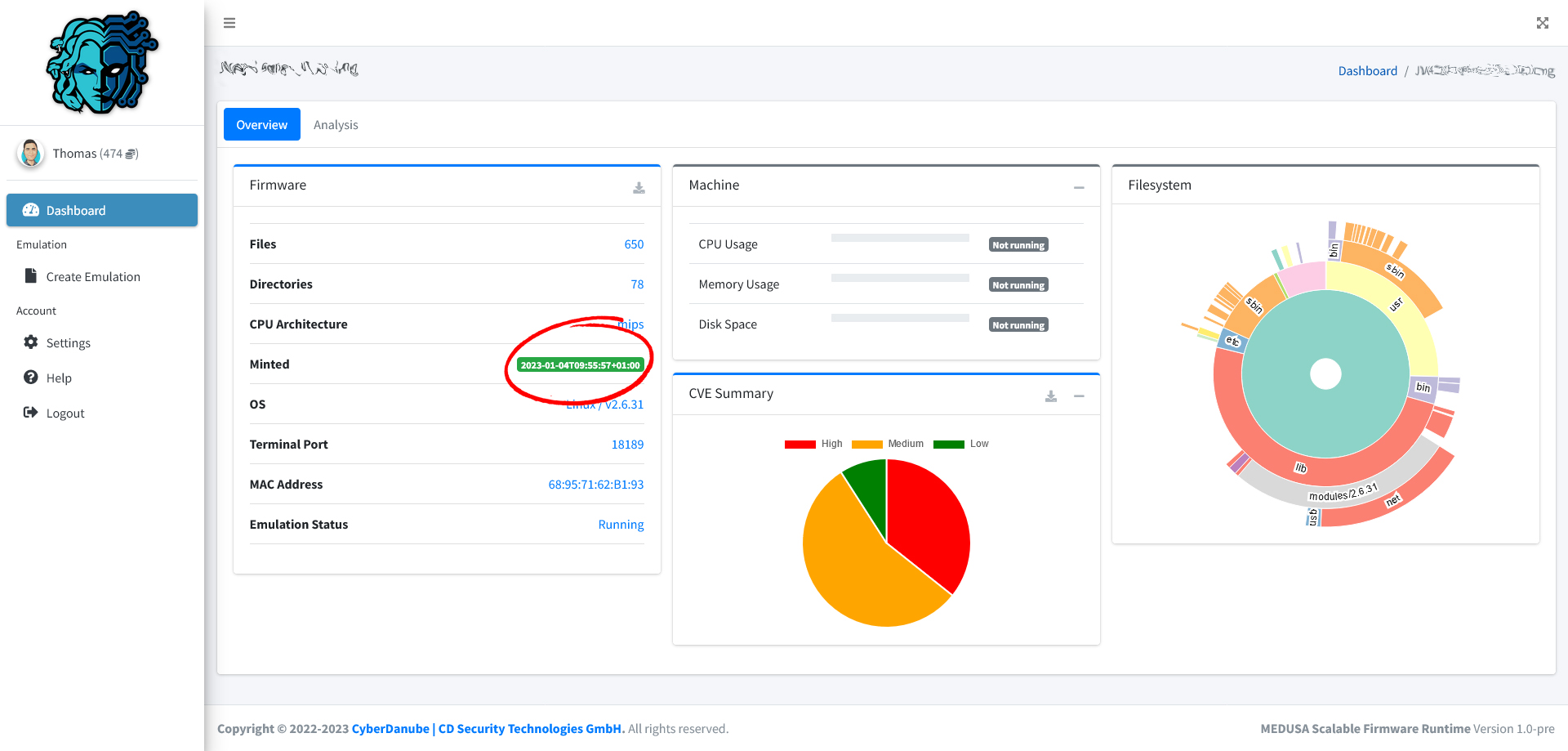 In addition to the executable "digital twin" that re-hosts physical devices as SaaS or local instance, MEDUSA also provides a static vulnerability analysis of the status quo from the vulnerability point of view. With this, known vulnerabilities in a firmware can be determined according to the CVE numbers.